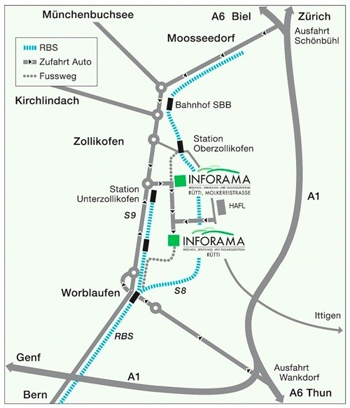 Transports publics : tous les quarts d'heure avec le RBS depuis la gare de Berne jusqu'à Worblaufen, Unterzollikofen ou Oberzollikofen. A partir de la station Unterzollikofen et Oberzollikofen, vous êtes à 10-15 minutes à pied d'INFORAMA Rütti et de l'exploitation de démonstration, et à 20-25 minutes à pied de la station Worblaufen.