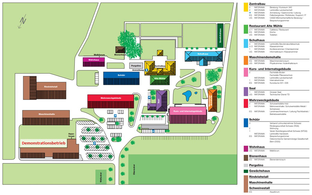 Les locaux de la ferme de démonstration, ses équipements et l'exposition des systèmes de traitement des eaux usées contenant des produits phytosanitaires, se trouvent sur le site d'INFORAMA Rütti. On y trouve en outre une salle de démonstration ainsi qu'une zone d'étable carrossable dans lesquelles les démonstrations d'appareils peuvent avoir lieu. En cas de besoin (et en s'annonçant à temps), il est possible de visiter l'entrepôt de produits phytosanitaires et l'aire de remplissage et de lavage de la ferme Rütti voisine, et de mettre à disposition un pulvérisateur (Lemken Sirius 10/1300) pour des cours ou des démonstrations.