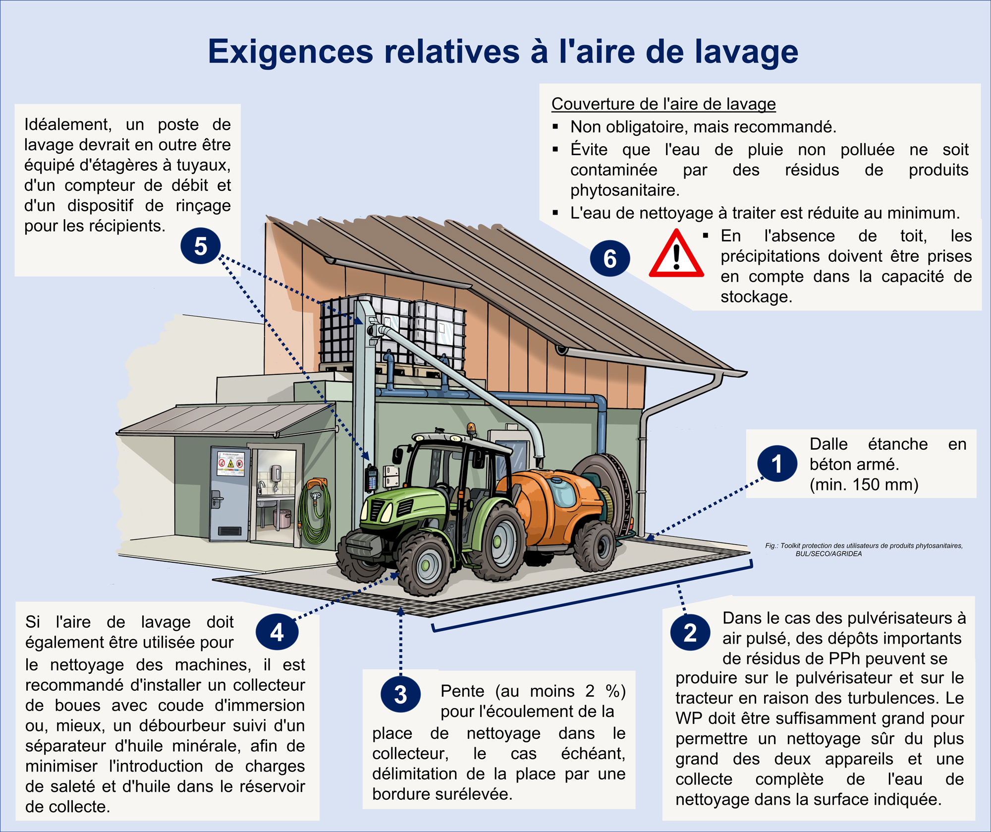 Le poste de lavage fixe est constitué d'une dalle étanche en béton armé. Il doit disposer d'une pente et d'une bouche d’évacuation permettant de recueillir l'eau de lavage et de l'acheminer vers un réservoir collecteur. Un toit sur l'aire de lavage n'est pas obligatoire, mais il est recommandé. Un toit permet d'éviter que l'eau de pluie ne soit contaminée par des résidus de pulvérisation.