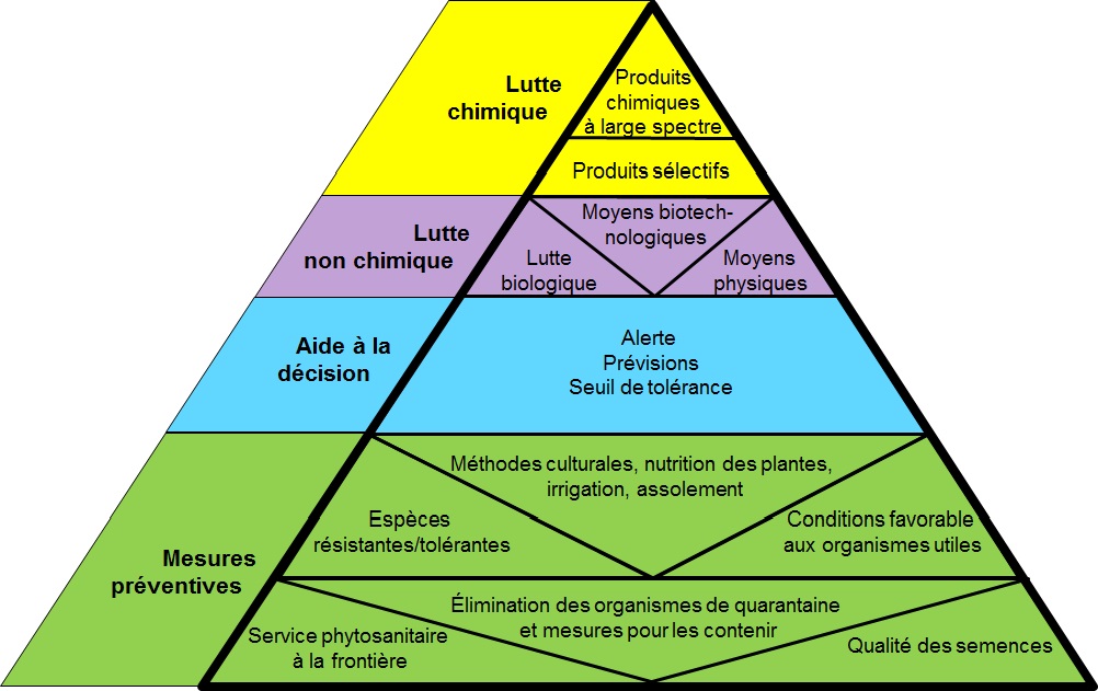 Les différents leviers qui font partie de la lutte intégrée contre les ravageurs sont présentés en détail dans les pages thématiques suivantes, avec des informations et des outils supplémentaires. Inspiré de la pyramide de la protection intégrée des cultures, l'aperçu est divisé en protection non chimique des cultures, systèmes de prévisions, seuils de lutte, protection chimique et smartfarming.