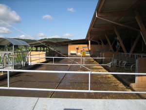 Aire d’exercice accessible en permanence  : le revêtement ne présente pas de détérioration visible, les eaux à évacuer ne s’écoulent pas vers des eaux de surface ou vers une conduite d’eau pluviale. Les eaux pluviales ne s’écoulent pas à côté de l’aire d’exercice (il y a par ex. une bordure, une pente suffisante vers l’orifice conduisant à la fosse à lisier, évacuation dans la fosse à lisier, etc.).