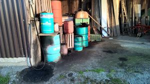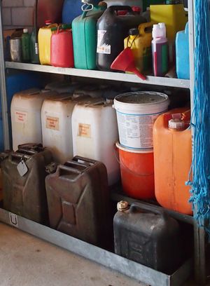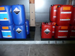 Les fluides qui fuient ne peuvent pas atteindre les eaux de surface, les grilles d’eaux claires, les grilles reliées aux égouts. Pour les contenants de plus de 20 litres, une cuve de rétention doit être présente. Elle doit avoir au minimum la capacité du plus grand bidon. Il est également possible d’utiliser l’ensemble du local de stockage comme cuve de rétention. La condition préalable est que le sol soit imperméable, c’est-à-dire qu’il ne présente ni trous ni fissures, et que des mesures structurelles (par ex. un seuil de porte) empêchent les produits d’atteindre l’environnement. Le matériau absorbant est prêt à retenir rapidement tout produit phytosanitaire qui fuirait.