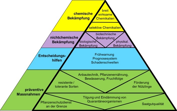 Der chemische Pflanzenschutz stellt eine wichtige Säule beim Schutz der Kulturen dar. Gemäss der guten landwirtschaftlichen Praxis sollte er aber erst zum Einsatz kommen, wenn alle anderen Massnahmen ausgeschöpft sind. Dies basiert auf dem Prinzip des integrierten Pflanzenschutzes, der übersichtlich in dieser Pyramide dargestellt ist.