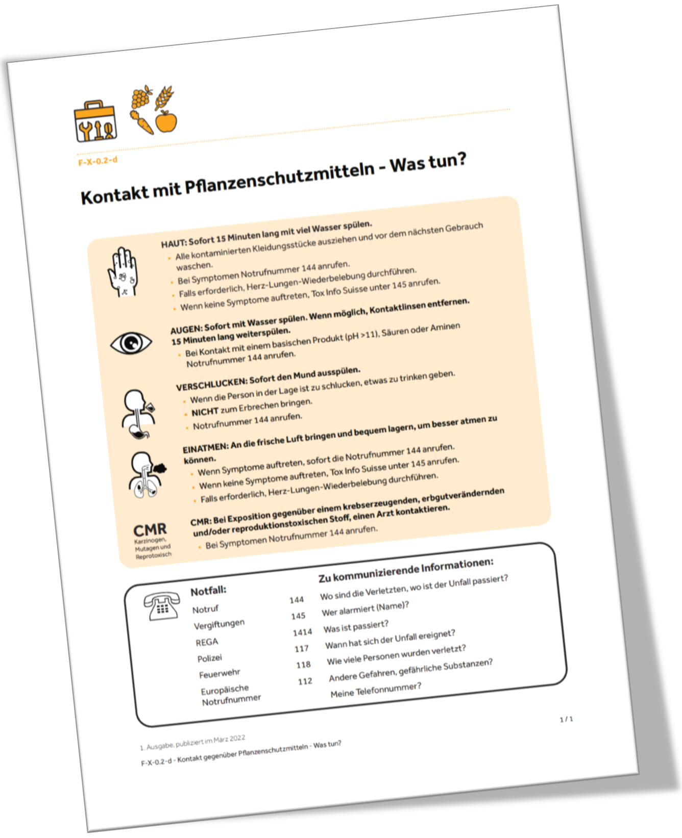Beim Kontakt mit Pflanzenschutzmitteln müssen die Sofortmassnahmen sowie die Notfallnummern bekannt sein. In der Hektik gehen diese Grundlagen aber oft vergessen. Deshalb gehört dieses Poster an jeden Lagerschrank, Umkleideraum und Anmischbereich.