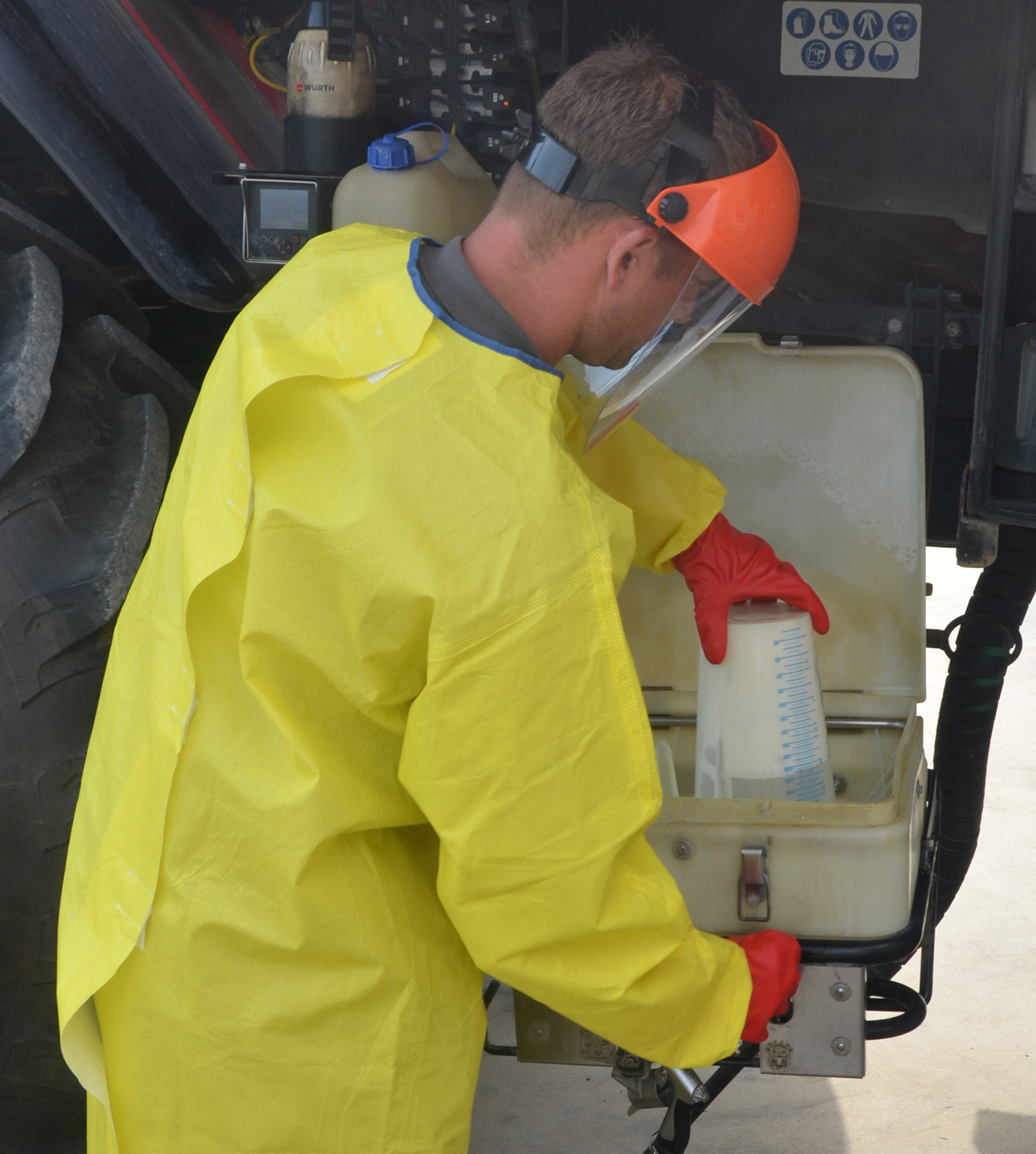 Pour mélanger les produits, l’opérateur doit se protéger selon les instructions figurant sur l’étiquette ou sur la notice du produit. Un standard de protection de l’utilisateur a été créé. Il consiste en un code couleur (jaune/orange/rouge) pour chaque étape d’utilisation qui définit les équipements à mettre en fonction de la toxicité et de l’exposition au produit (voir tableau ci-dessous). Pour la préparation, l’équipement standard est identique pour les trois couleurs : gants de protection, tablier à manche ou combinaison de protection, écran protège-visage ou lunettes fermées. En plus pour le niveau 3 (rouge), le masque A2/P3 peut faire partie des équipements selon la toxicité du produit ou sa formulation (poudres, granulés).