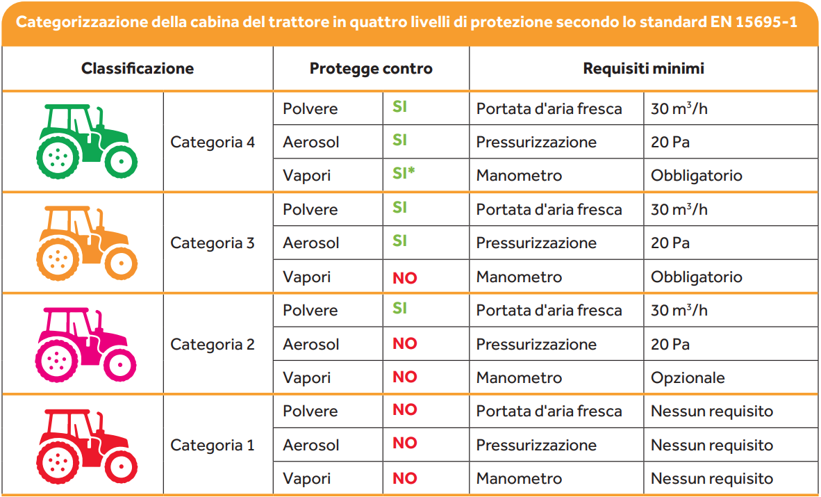 La categoria è di solito indicata in cabina su una targhetta o un adesivo. Per le cabine di categoria 4, il filtro ha tre livelli: un pre-filtro (particelle grossolane), un filtro antiparticolato (polveri e aerosol) e un filtro a carbone attivo (vapori e gas). Il filtro deve soddisfare i requisiti della norma EN 15695-2. I trattori più vecchi ma con una cabina ermetica e ben tenuta, aria condizionata e un filtro a tre stadi sono considerati una protezione sufficiente. All‘interno della cabina, l‘operatore dovrebbe in ogni caso indossare indumenti dedicati esclusivamente alla manipolazione dei prodotti fitosanitari. In cabina dovrebbero esserci una scatola di guanti monouso o un paio di guanti puliti e riutilizzabili, ugelli di ricambio, asciugamani di carta e un piccolo sacchetto per i rifiuti. L‘irroratrice deve essere inoltre dotata di un contenitore di acqua fresca per risciacquare i guanti e le mani.