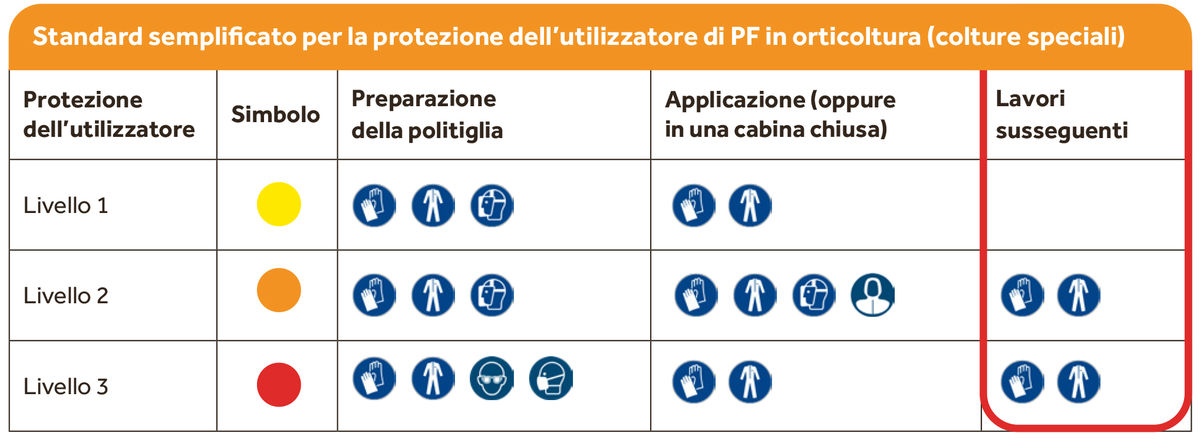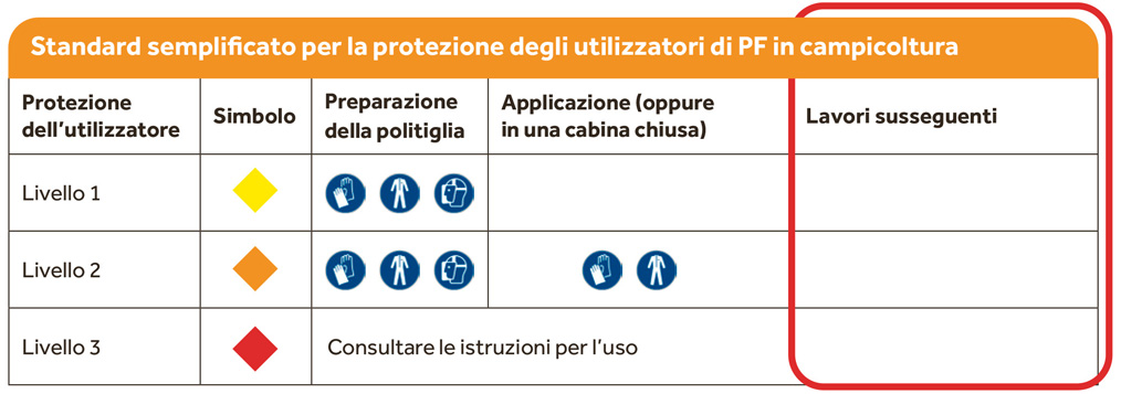 Per i prodotti per i quali, nonostante l’uso di abiti da lavoro e guanti, non è possibile eseguire i lavori susseguenti in modo sicuro il giorno dopo i trattamenti, sono stati stabiliti dei tempi di rientro. Durante questo periodo, è assolutamente proibito eseguire lavori sulla parete fogliare (anche indossando i DPI). Prima di entrare nuovamente nella coltura trattata in sicurezza, con abiti da lavoro e guanti, si deve aspettare che i residui sulle foglie si siano sufficientemente degradati. Soltanto per i prodotti di livello 3 (rosso), secondo lo standard semplificato per la protezione degli utilizzatori di PF, sono prescritti dei tempi di rientro.