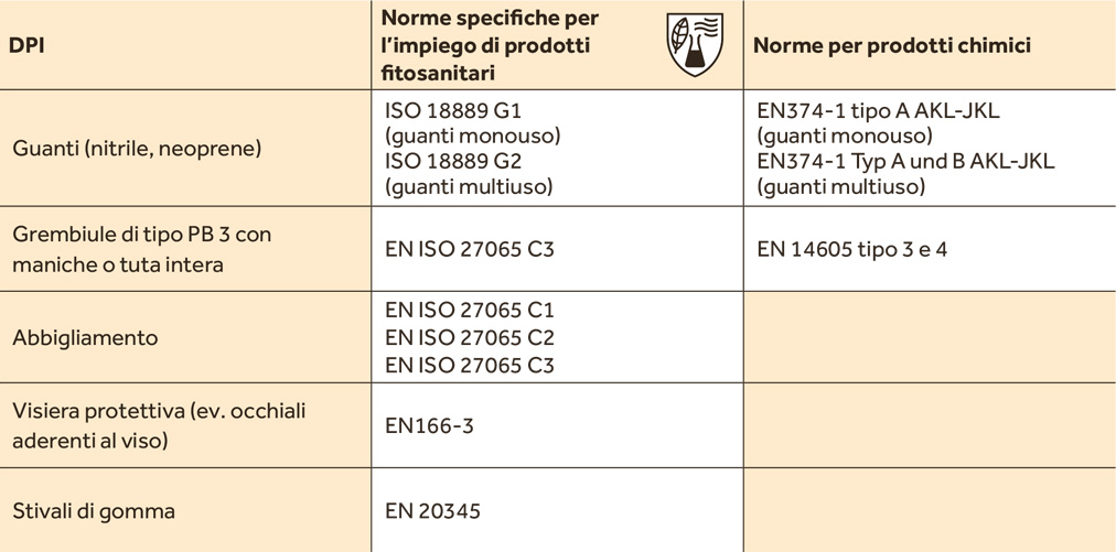 Tutte le attrezzature e gli indumenti devono essere utilizzati esclusivamente per il trattamento. I DPI devono soddisfare le seguenti norme:
