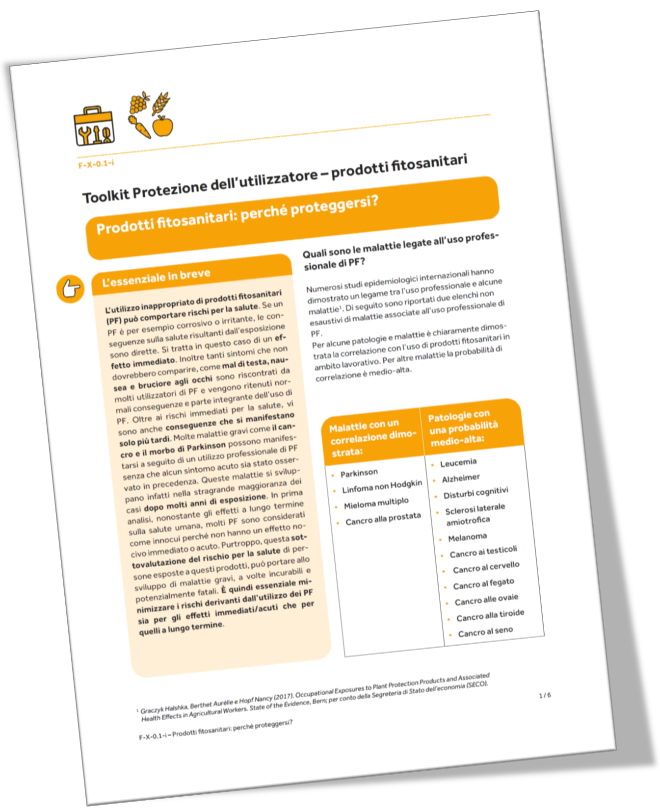 L'uso inappropriato dei prodotti fitosanitari (PF) può comportare rischi per la salute. In caso di contatto con i PF, non si osservano solo sintomi acuti, ma anche effetti che si manifestano solo con un certo ritardo. Per questo motivo il rischio per la salute è spesso sottovalutato dall'utiliz-zatore. Scoprite qui perché è importante proteggersi efficacemente dal contatto con i PF.