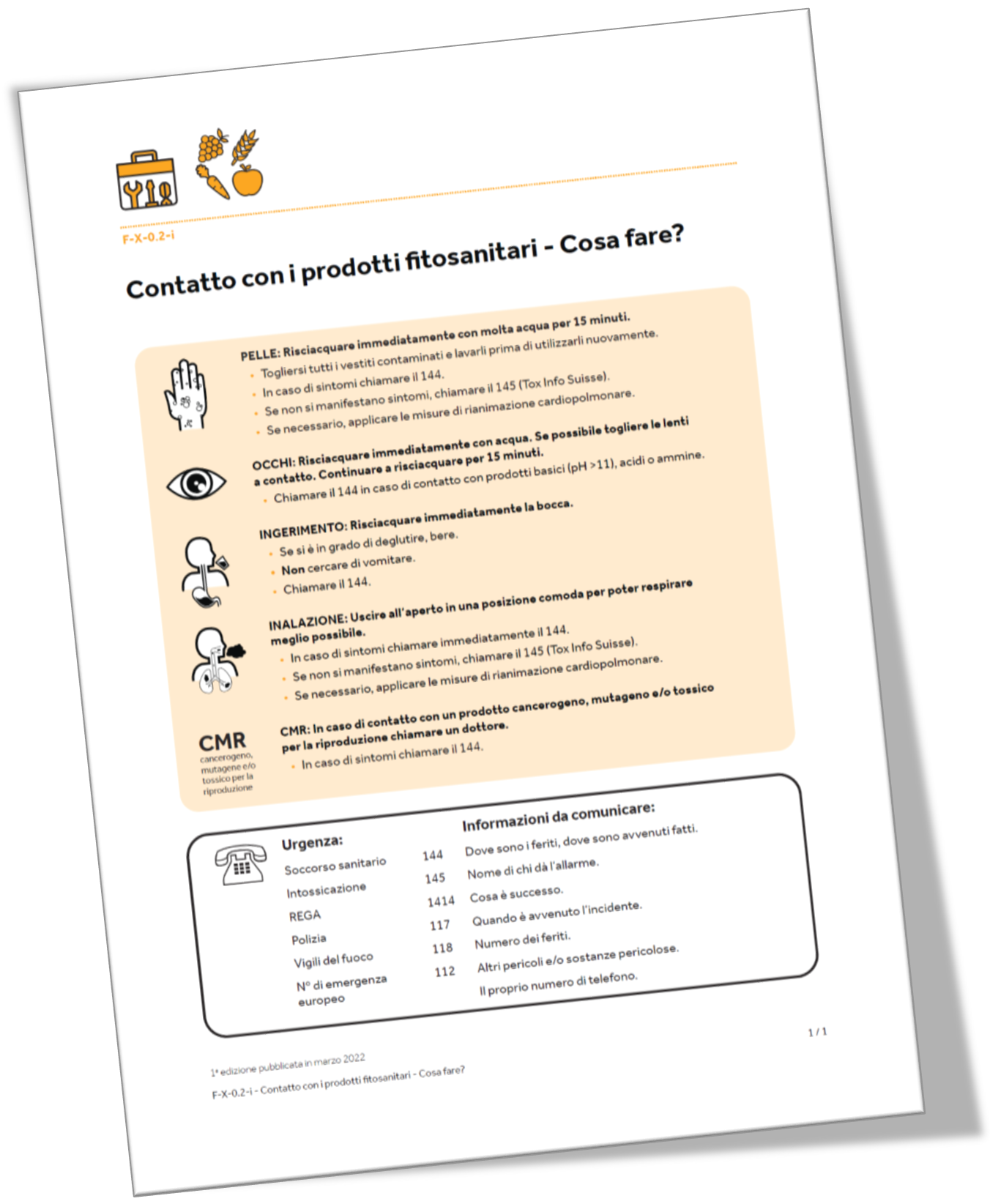 In caso di contatto accidentale con prodotti fitosanitari, si devono conoscere le misure di primo soccorso e i numeri di emergenza. Tuttavia, in una situazione di stress e fretta, queste basi ven-gono spesso dimenticate. Ecco perché è importante appendere questo poster ad ogni armadiet-to, spogliatoio e area di preparazione della poltiglia.